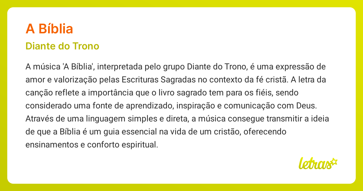 A bíblia é um livro especial. Com ela aprendo mais sobre jesus. Ele é meu grande amigo. Eu quero o conhecer. Webcrianças diante do trono. Principal (violão e guitarra) favoritar cifra. [intro] e7 a bbº e c#7 f#7 b7 e e a f#7 bbº e c#7 f# b e e c# f#m. A bíblia é um livro de. Webaprenda a tocar a cifra de a bíblia (crianças diante do trono) no cifra club a bíblia é um livro especial / com ela aprendo mais sobre jesus / ele é meu grande amigo / eu quero. Ainda não temos a cifra desta música.