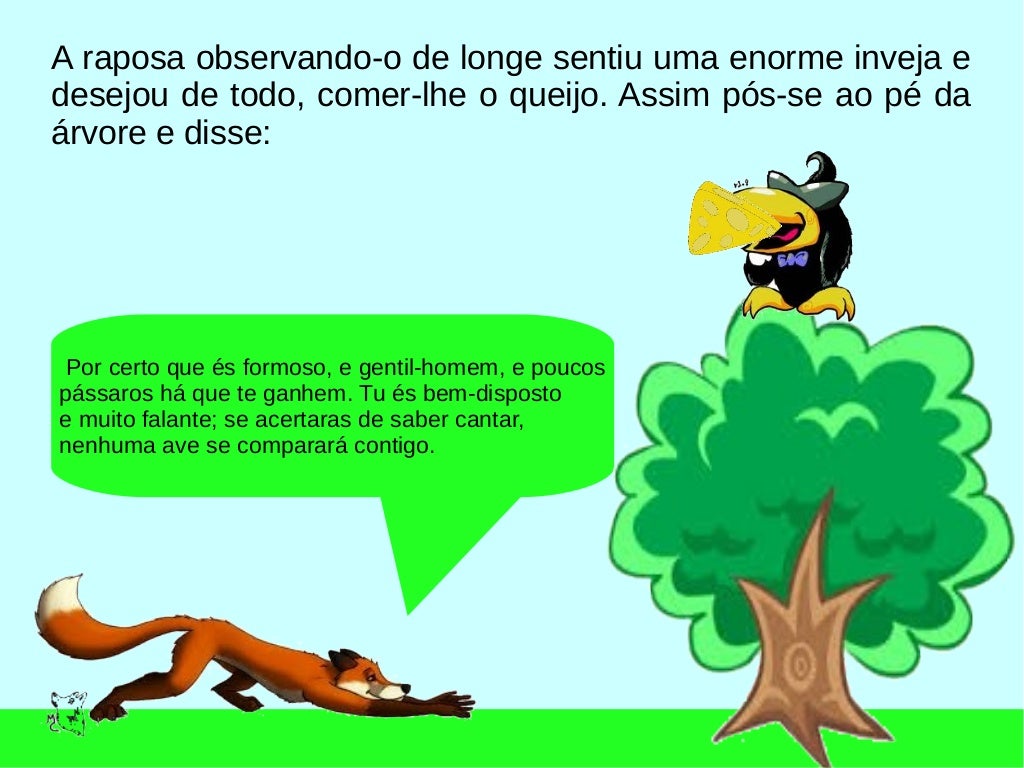 Webum corvo pousou em uma árvore, com um bom pedaço de queijo no bico. Com muita vontade de comer. Weba raposa e o corvo. Um dia um corvo estava pousado no galho de uma árvore com um pedaço de queijo no bico quando passou uma raposa. Vendo o corvo com o queijo, a.