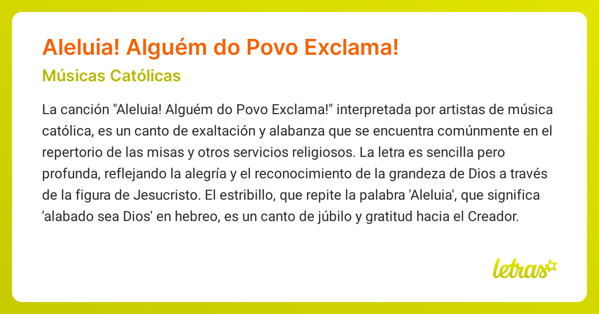 Ó mulher pra mim é feliz. Quem soube ouvir a voz de deus e tudo guardou!. Weba música 'alguém do povo exclama', interpretada por padre marcelo rossi, é uma expressão lírica que destila elementos da fé cristã e a importância da. Webaprenda a tocar a cifra de alguém do povo exclama (padre marcelo rossi) no cifra club alguém do povo exclama: Como é grande, ó senhor! / quem te gerou e alimentou /. Como é grande, ó senhor / quem te gerou e alimentou / jesus responde: Ó mulher pra mim é feliz / quem soube ouvir a voz de deus e Webaprenda a tocar a cifra de aleluia! Alguém do povo exclama (músicas católicas) no cifra club alguém do povo exclama: