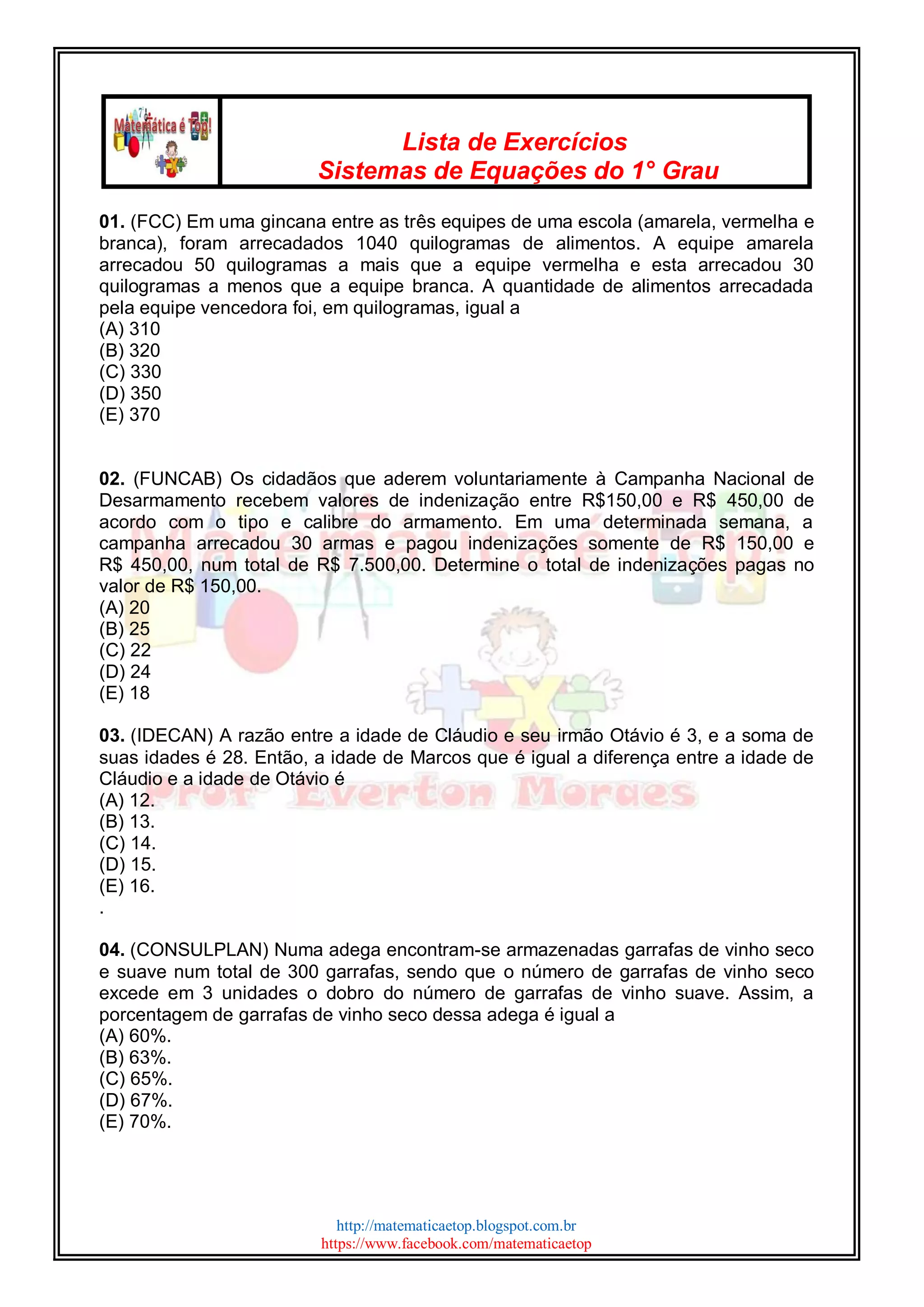 Webbaixe arquivos em pdf ou word com listas de exercícios sobre equações do 2º grau, separadas por assuntos. Encontre questões sobre fórmula resolutiva, delta, forma. Webveja como resolver quatro questões de sistemas de equações do primeiro grau com aplicação em problemas de geometria, moedas, estradas e energia. De conceitos básicos a problemas mais complexos, garantindo uma compreensão completa e sólida. Webuma lista de exercícios com problemas resolvidos e verificações de sistemas de equações do 1º grau, com dicas e gabarito. O arquivo é em pdf e pode ser baixado ou. Webveja exemplos de problemas envolvendo sistemas de equação do 1° grau com duas incógnitas, como geladeira, coxinha, prateleira, jogo, moeda, pasto e figuras. Webo documento apresenta 6 sistemas de equações do 1o grau com duas incógnitas para serem resolvidos pelos métodos da substituição e da adição. Webveja como resolver equações usando sistema de equações com exemplos práticos e respostas. Aprenda a usar o método da substituição ou da adição para encontrar as.
